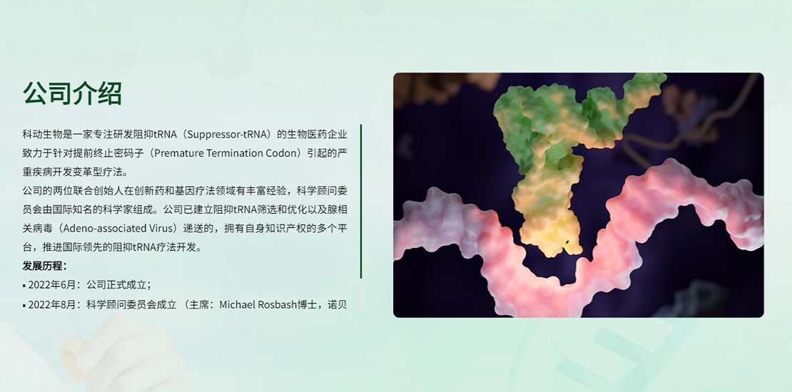 科动生物是一家专注研发阻抑tRNA(Suppressor-tRNA)的生物医药企业致力于针对提前终止密码子(Premature Termination Codon)引起的严重疾病开发变革型疗法。 公司的两位联合创始人在创新药和基因疗法领域有丰富经验,科学顾问委员会由国际知名的科学家组成。公司已建立阻抑tRNA筛选和优化以及腺相关病毒(Adeno-associated Virus)递送的,拥有自身知识产权的多个平台,推进国际领先的阻抑tRNA疗法开发。